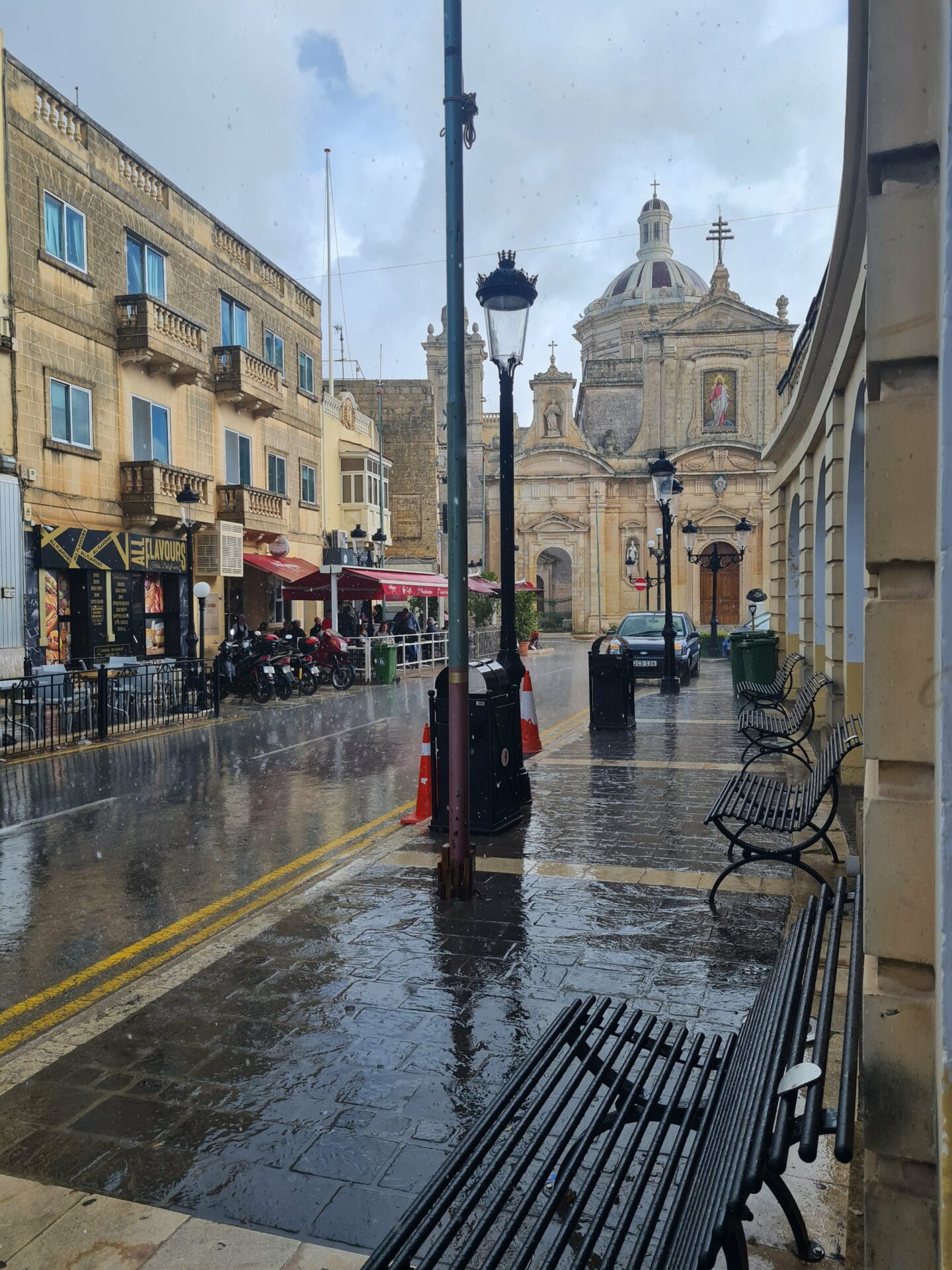 Even though Gozo and the Blue Lagoon had me completely stranded, I couldn’t stop thinking about the streets of Valletta, Rabat, and Mdina. The moment I stepped off the bus in Rabat, I was greeted by a huge, dramatic rainfall that came out of nowhere. I ended up hiding in a tiny café with a view of the cathedral, watching people gather for what looked like a final goodbye to someone they loved. It was strangely intimate, like I had accidentally stepped into someone else’s quiet heartbreak, while I was still in mine.